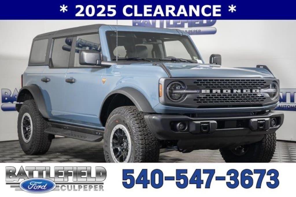 2025 Ford Bronco Badlands 12"LCD CTR STACK TOUCHSCRN ADVANCED 4X4 BADLANDS SUSPENSION BRAKES, 4-WHEEL DISC/ABS FORDPASS CONNECT FRNT/REAR LOCKING DIFFRNTL FRONT STA-BAR DISCONNECT HILL START ASSIST PRE-COLLISION ASSIST W/AEB PUSH-BUTTON START REAR VIEW CAMERA SIRIUSXM W/360L- NA AK&HI TER MGMT W/G.O.A.T. MODES TOOL KIT- DOOR/TOP REMOVA, 4.7 Final Drive Ratio, Auto High-beam Headlights, Auto-dimming Rear-View mirror, Carbonized Gray Molded-In-Color Hard Top, Emergency communication system: 911 Assist, Equipment Group 331A Standard Package, Exterior Parking Camera Rear, Hard Top Sound Deadening Headliner, Heated front seats, Heated steering wheel, High Clearance Fender Flares, High Clearance Suspension, Position-Sensitive Bilstein Shock Absorbers, Raptor-Style Running Board, Rear-Window Defroster & Washer, Remote keyless entry, Sasquatch Package, SiriusXM w/360L, SYNC 4, Trailer Tow Package (DIO), Wheels: 17" Carbonized Gray Painted Aluminum. Price includes: $2750 - Retail Customer Cash. Exp. 04/30/2026 $750 - Bonus Customer Cash. Exp. 04/30/2026