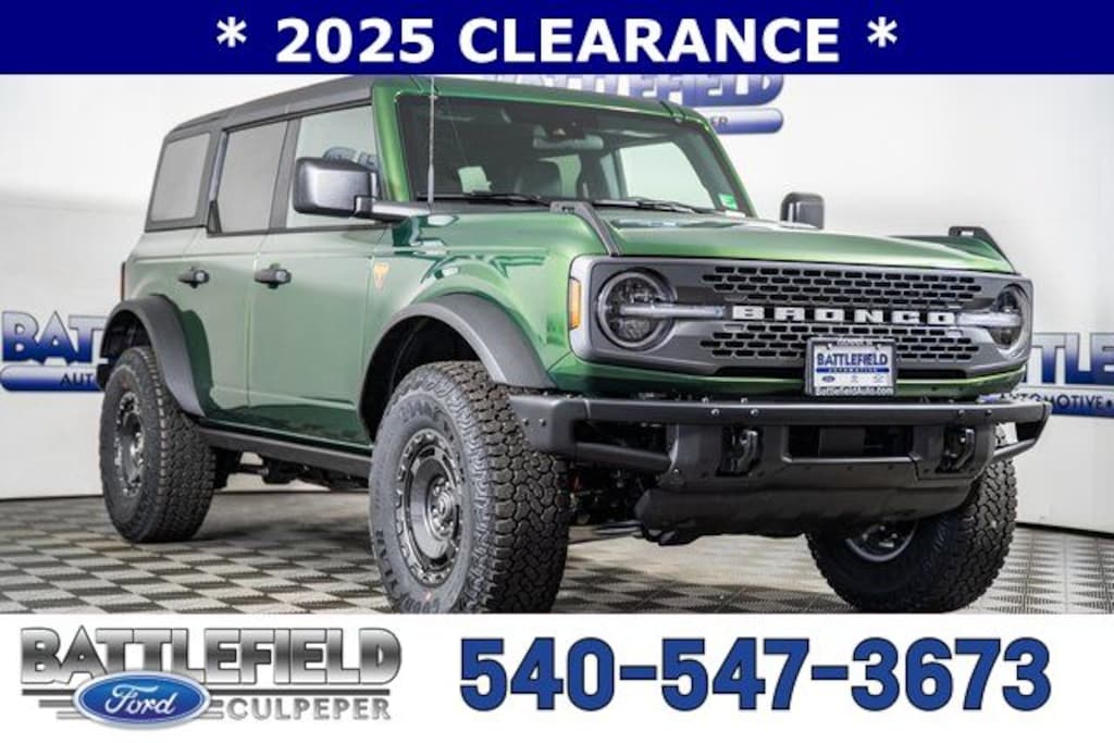 2025 Ford Bronco Badlands 12"LCD CTR STACK TOUCHSCRN ADVANCED 4X4 BADLANDS SUSPENSION BRAKES, 4-WHEEL DISC/ABS FORDPASS CONNECT FRNT/REAR LOCKING DIFFRNTL FRONT STA-BAR DISCONNECT HILL START ASSIST PRE-COLLISION ASSIST W/AEB PUSH-BUTTON START REAR VIEW CAMERA SIRIUSXM W/360L- NA AK&HI TER MGMT W/G.O.A.T. MODES TOOL KIT- DOOR/TOP REMOVAL, ROCK RAILS REMOTE START SYSTEM, 2-Door Intelligent Access w/Lock/Unlock, 4.7 Final Drive Ratio, Ambient Footwell Lighting, Auto High-beam Headlights, Auto-dimming Rear-View mirror, Carbonized Gray Molded-In-Color Hard Top, Connected Navigation, Dr & Pass Illuminated Sliding Visor Vanity Mirrors, Dual Smart Charging USB Ports, Dual-Zone Electronic Automatic Temperature Control, Emergency communication system: 911 Assist, Equipment Group 332A Mid Package, Exterior Parking Camera Rear, Ford Performance Heavy-Duty Modular Front Bumper, Front Row Heated Seats, Heated front seats, Heated steering wheel, High Clearance Fender Flares, High Clearance Suspension, HOSS 3.0 w/FOX Internal Bypass Dampers, Leather Shift Knob, Leather-Trimmed/Vinyl Bucket Seats, Position-Sensitive Bilstein Shock Absorbers, Power Outlet - Back Side of Center Floor Console, Rear Parking Sensors, Rear-Window Defroster & Washer, Remote keyless entry, Sasquatch Package, SiriusXM w/360L, SYNC 4, Trailer Tow Package (DIO), Wheels: 17" Carbonized Gray Painted Aluminum. Price includes: $2750 - Retail Customer Cash. Exp. 04/30/2026 $750 - Bonus Customer Cash. Exp. 04/30/2026