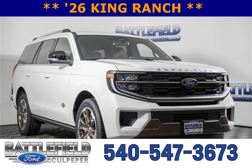 2026 Ford Expedition King Ranch 24" PANORAMIC DISPLAY 13.2" CENTER DISPLAY 4-DR INTELLIGENT ACCESS B&O UNLEASHED, 22 SPKR CONT. CONTROLLED DAMPING FORD APP FORD CO-PILOT360ACTIVE2.0 HILL DESCENT CONTROL HILL START ASSIST INTELLIGENT 4WD SYSTEM PRO POWER ONBOARD - 400W REMOTE START W/ FORD APP TERRAIN MANAGEMENT SYSTEM W/ SELECTABLE DRIVE MODES TWO-SPEED TRANSFER CASE, 4WD, 3.73 Axle Ratio, Apple CarPlay/Android Auto, Auto High-beam Headlights, Auto-dimming Rear-View mirror, Automatic temperature control, Digital Device Holder, Emergency communication system: 911 Assist, Equipment Group 400A, Exterior Parking Camera Rear, Ford Connectivity Package (1-Year Included), Ford Digital Experience, Genuine wood dashboard insert, Genuine wood door panel insert, Heated front seats, Heated rear seats, Heated steering wheel, Heated/Ventilated Premium Del Rio Leather Front Captain's Chairs, Leather steering wheel, Memory seat, Navigation System, Power moonroof: Vista Roof, Radio: B&O Unleashed Sound System by Bang & Olufsen, Rain sensing wipers, Remote keyless entry, SiriusXM with 360L, Ventilated front seats, Wheels: 22" x 9.0" Diamond Cut Machined Face Aluminum.